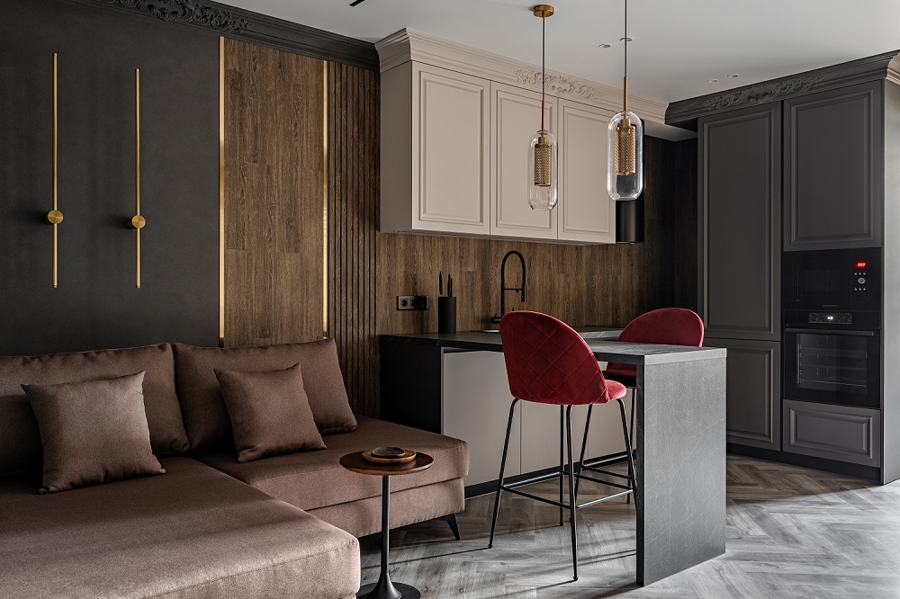 Нейтральные оттенки балансируются целым набором из текстур: ёлочка под дерево, камень, чёрное стекло, деревянные фасады, матовые ткани рисуют объем этой картины.