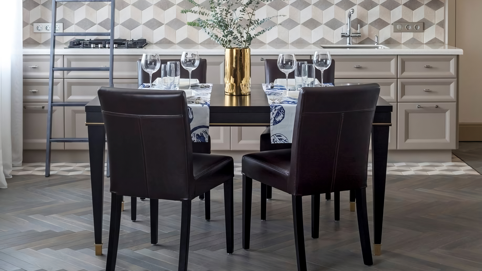 Ровным симметричным рисунком у вас дома может стать, например, паркетная укладка ёлочкой. Водостойкий кварцевый ламинат выглядит как настоящее дерева, при этом такой пол можно уложить ёлочкой даже в ванной, где симметричные зеркала, полки и другие предметы интерьера выглядят особенно стильно.
