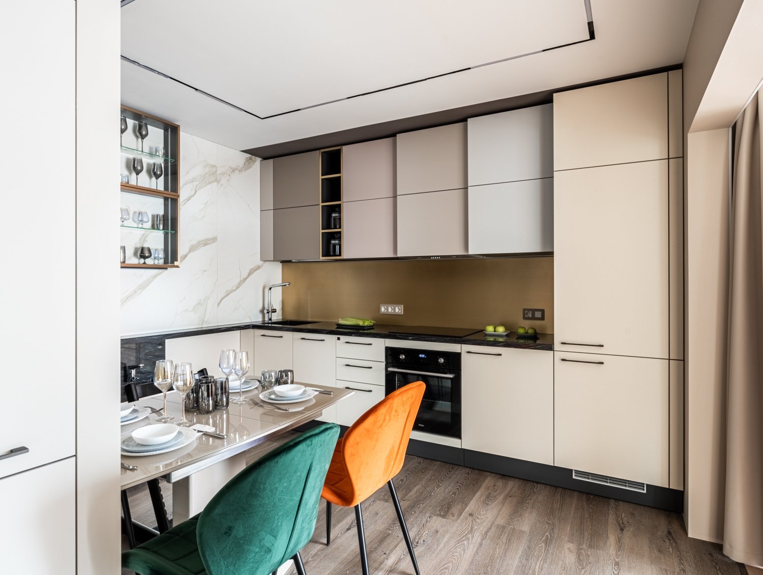 Перед дизайнером Татьяной Кононовой-Левиной стояла задача сделать так, чтобы на кухне было удобно жить, готовить и творить всем жителям квартиры, но и чтобы Данил смог пользоваться удобствами, такими элементарными, как сделать самому себе чай, набрать воды, сделать себе бутерброд. И задача удалась!