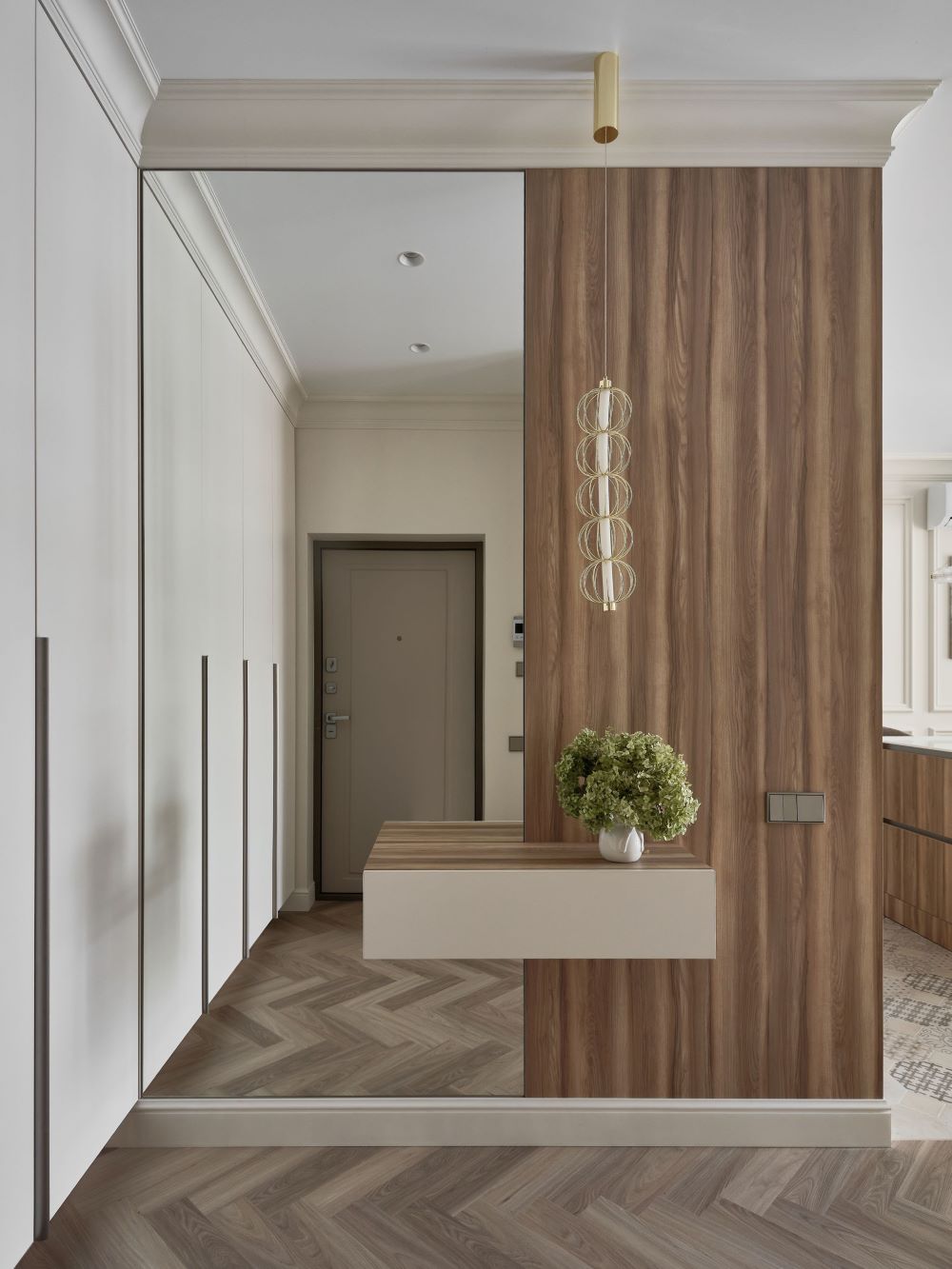 Классика этого интерьера читается в деталях — филёнках на стенах, широких карнизах и спокойной симметрии. Пространство звучит современно и легко, как продуманная композиция без лишних нот. Акцентная стена в цвете хаки добавляет интерьеру глубину и гармонично объединяется с тёплым деревом в отделке.